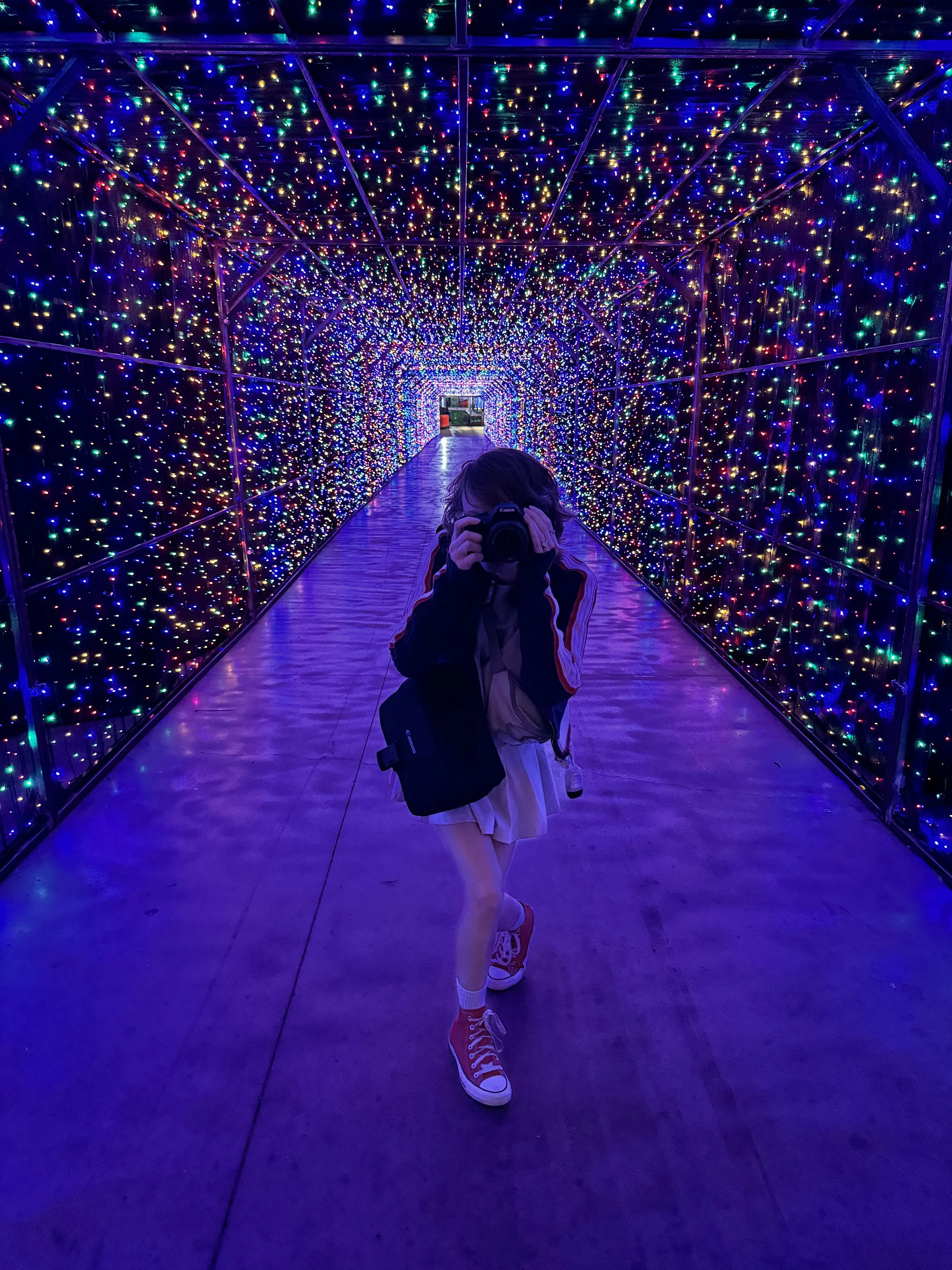 The venue has both its own food and drink vendors as well as inviting local food vendors to provide a variety of yummy options. We stopped at “The Corn Dog Company” for a honey drizzled Corn Dog. To our surprise, Buddy the Elf appeared requesting a review, touting that honey was superior because “They don’t have maple syrup so that's the best thing to do”. The welcome surprise was not the only magical character visitors will encounter on their adventures at Peppermint Parkway, however. Notable faces like Santa and Mrs. Clause also walk around the property to spread Cheer alongside the events namesake mascots, Pepper and Mint! The Plaza also includes a petting zoo, complete with adorable miniature goats, chickens and ducks. This along with the “Mistletoe Kissing Booth”, and many others, these make for perfect opportunities for adorable photos! My husband and I’s favorite photo spot of the day though, has to go the the beautiful tunnel of lights located just off of pit lane! For the kids, there's a booth set up to send letters to Santa Clause, some fun rides and even a kids mini-Go-Karting track fit for a mini-Max Verstappen! This event has something for all ages, making it well worth the trip!